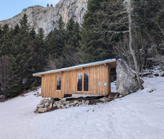 Un abri en bois de mélèze issu de la forêt communale de Lans-en-Vercors. Il s’agit d’un abri non gardé totalement rénové dans le cadre du programme du Parc Naturel Régional du Vercors, en lien avec la commune de Lans-en-Vercors. A l’intérieur, cette cabane dispose de 2 pièces, et du mobilier pour se restaurer (table et banc). Il est dépourvu de poêle à bois.